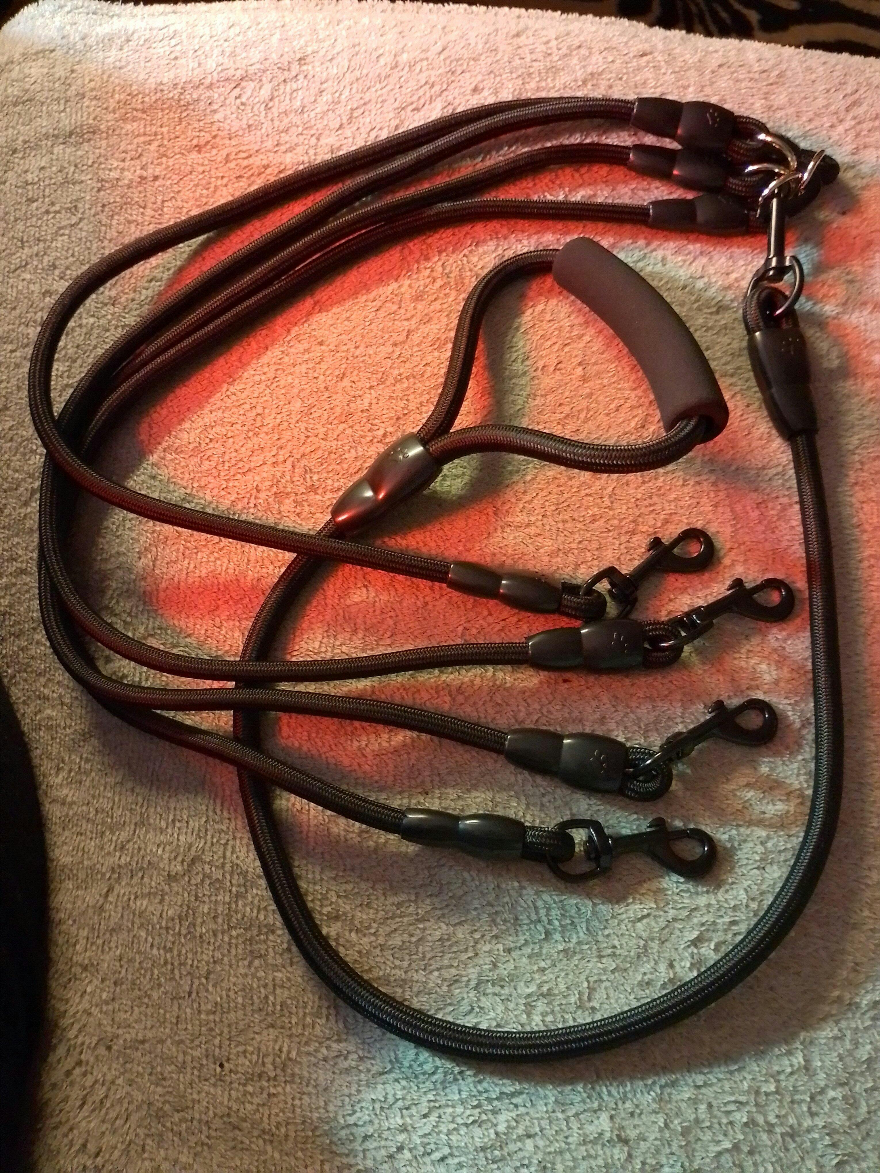 I'm a full-time dogwalker and bought this to help keep my group walks under control and a bit less tangled. Material and buckles seem nice and durable with a bit of flexibility on the chords. Handle feels comfy to hold and I like the little paw prints. Delivery took 6 working days, so not too bad, Next day delivery could be a good option for customers who want it sooner.